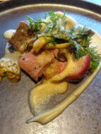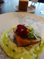 先日の「ブルディガラ」の前菜は4日かけてつくる厚切りサーモンの燻製。中がレアのようでトロッとして薫り高く、ヨーグルトを使ったソースともよく合いとても美味しかったです。